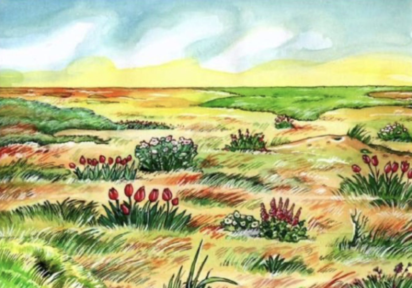 Мы представляем себе степь как сплошное поле с невысокими растениями: травами, кустарниками и цветами. На рисунок можно добавить животных, например, суслика, дрофу/журавля или пасущихся лошадей.