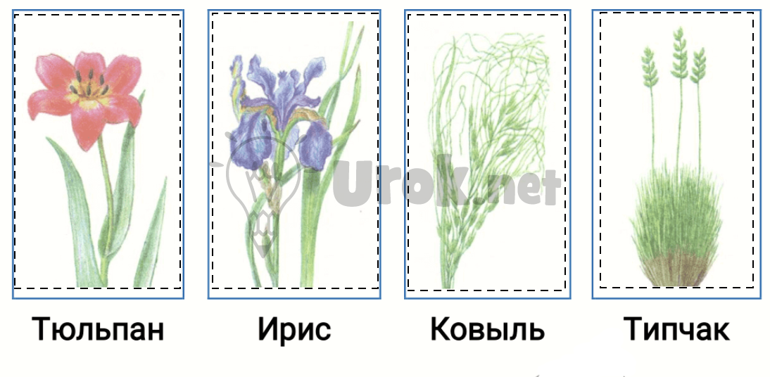 Мама Серёжи и Нади интересуется, знаешь ли ты степные растения. Вырежи рисунки из приложения и помести их в соответствующие окошки. Проверь себя по учебнику. После самопроверки наклей рисунки.