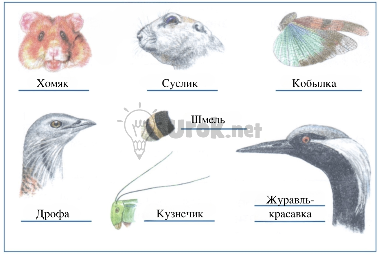 А это задание подготовил для тебя папа Сережи и Нади. Узнай животных степи по рисункам. Подпиши названия животных. Попроси рядом сидящего ученика проверить тебя.