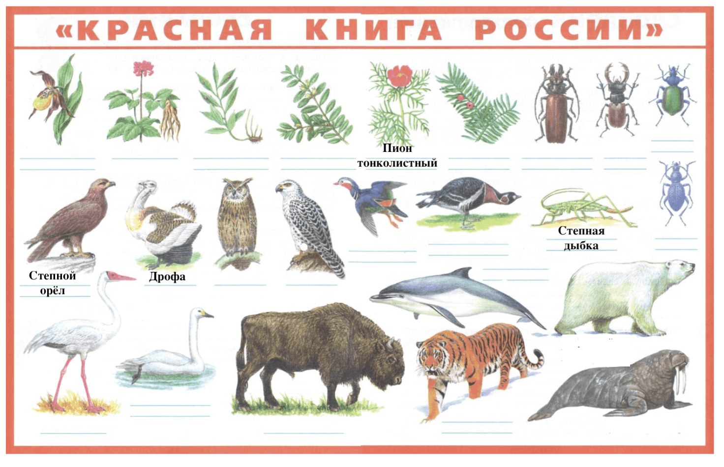 Продолжи заполнение плаката «Красная книга России», который нарисовал папа Сережи и Нади. Найди на плакате растение и животных степной зоны и подпиши их названия.