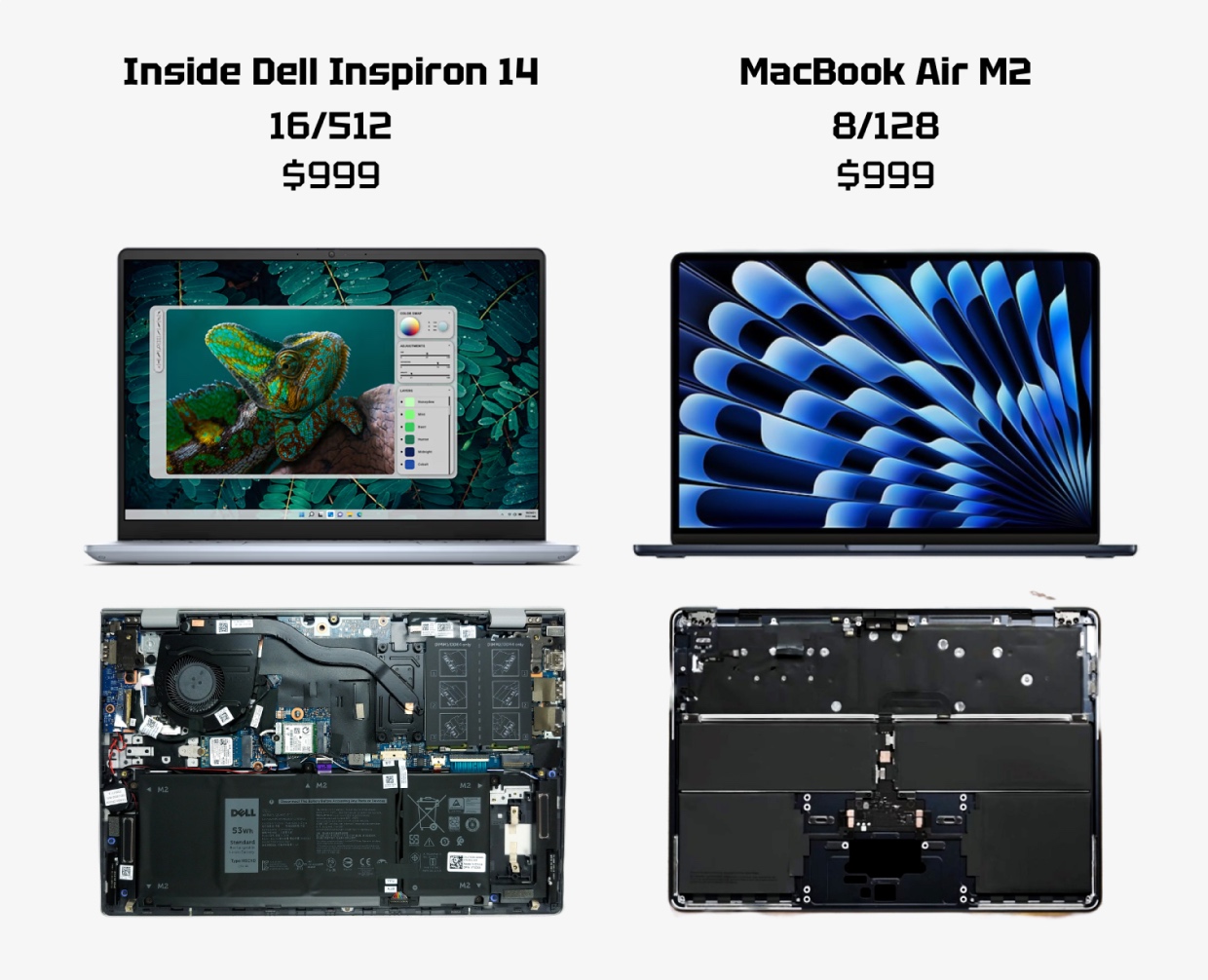 Материнская плата самых дешёвых Mac в 4 раза меньше, чем в Windows-компьютере за те же деньги, в MacBook Air нет активного охлаждения, RAM вшита в процессор, SSD распаян на плате, а потребление энергии в 4 раза меньше. У представленных конкурентов из общего только клавиатура и совместимые программы.