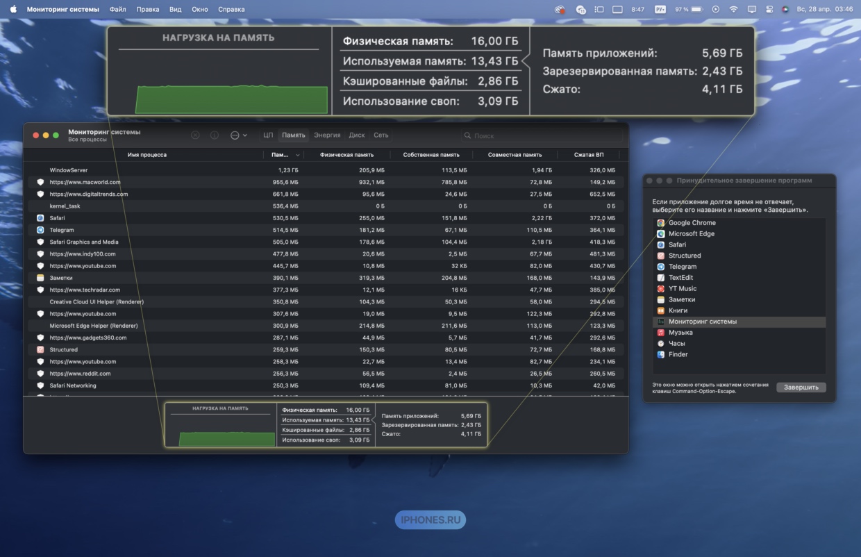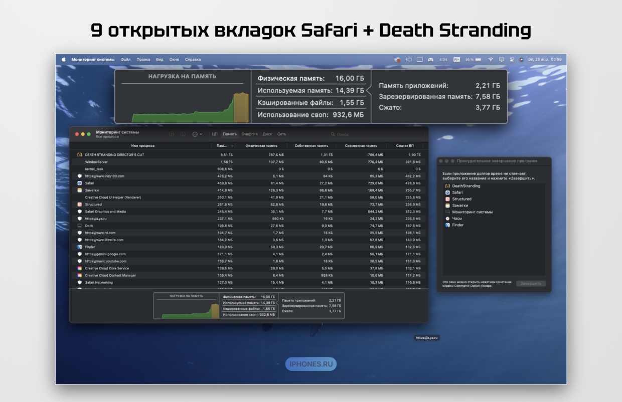 В общем, macOS тратит хоть какое количество RAM довольно расточительно ради гладкого опыта использования. Это как жить при хорошей зарплате и откладывать не 50%, а только 10%, хотя в обоих случаях с голода вы бы точно не умерли.