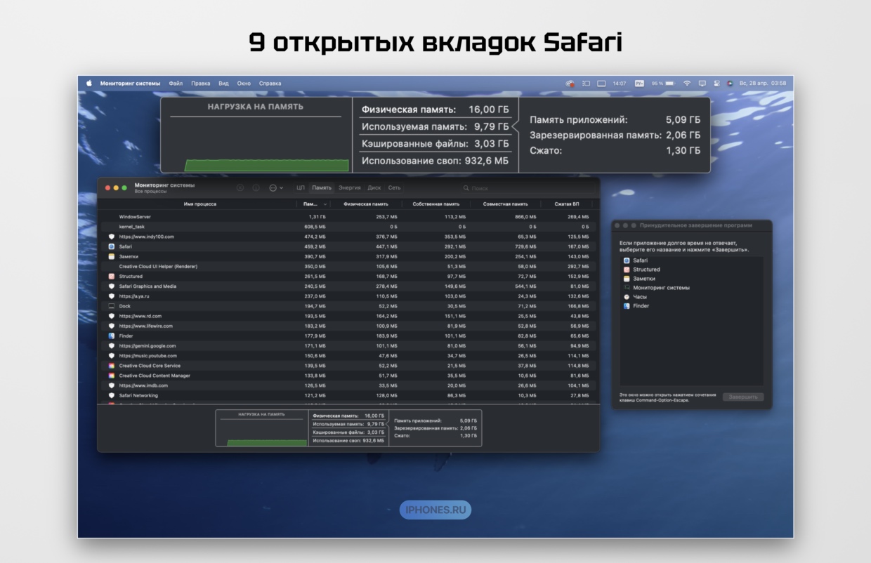 Как видите, большинство памяти ушло в зарезервированную, то есть в якобы свободную, но готовую действовать. Есть предположение, что тут Apple не договаривает, и большая её часть ушла на видеоядра.