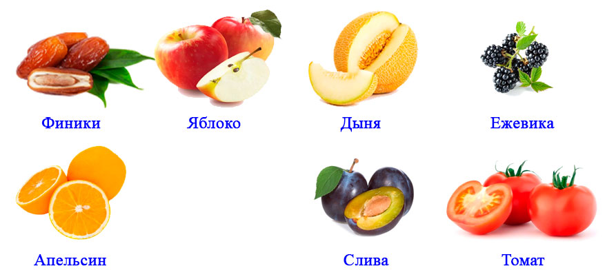 - Сочные плоды: финики, яблоко, дыня, ежевика, апельсин, слива, томат.