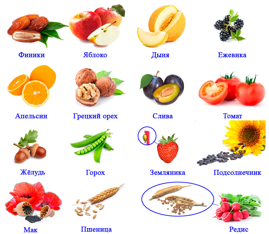 Сочные плоды: финики, яблоко, дыня, ежевика, апельсин, слива, томат. Сухие плоды: грецкий орех, жёлудь, горох, земляника, подсолнечник, мак, пшеница, редис.