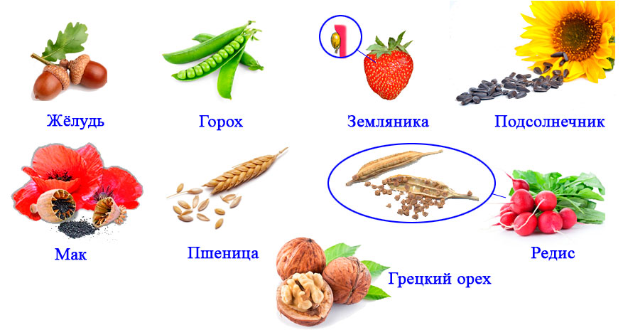 - Многосемянные: горох (боб), земляника (многоорешек), мак (коробочка), редис (стручок).