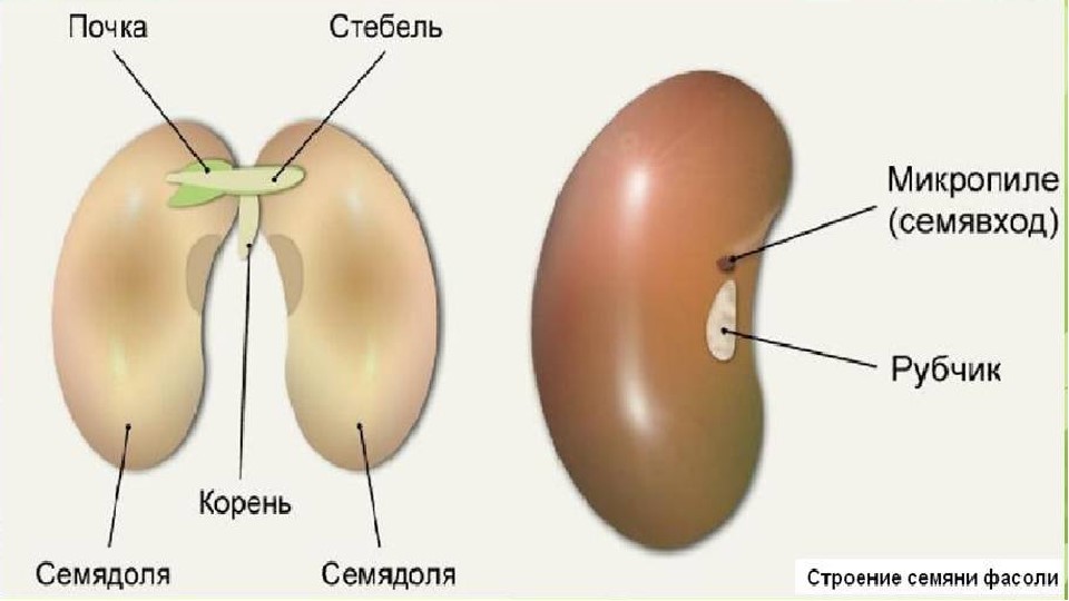 Семена снаружи покрыты семенной кожурой. На вогнутой стороне семени есть рубчик (место прикрепления к семяножке) и семявход (поступление воды и воздуха в семя). Внутри семена состоят из двух семядолей и небольшого зародыша. Зародыш имеет зародышевый корешок, зародышевый стебелек и зародышевые почечки.