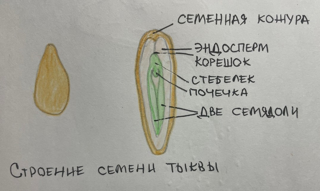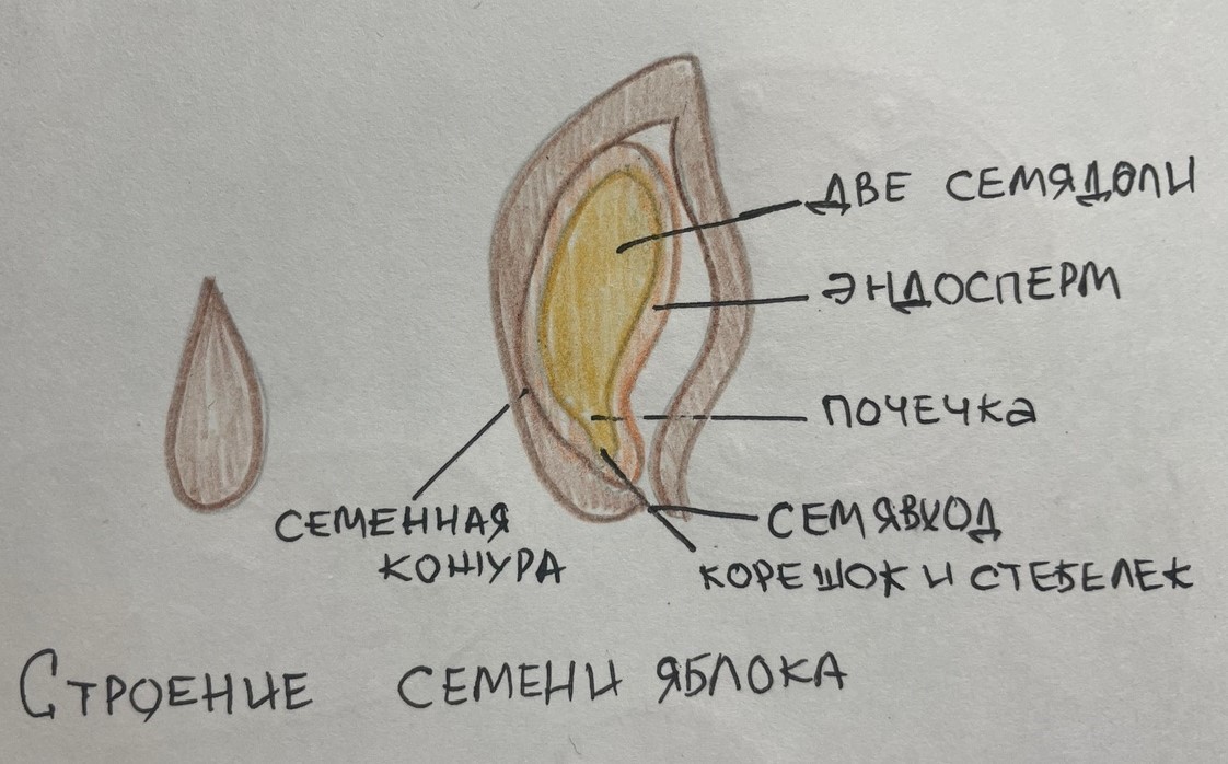 Строение семени яблони и тыквы схоже. У них есть семенной зародыш, состоящий из двух семядолей, расположенных напротив друг друга. Между ними находится зародышевый стебель, на котором образуются зачаточные листочки прямо в зародыше. Стебель с листочками формирует почку, которая является зачатком основного побега. В состав семени также входит корешок. У зародыша имеется ось, на верхушке которой находится почка и симметрично расположенные семядоли. Внутри семядолей находятся клетки с большим запасом питательных веществ.